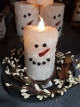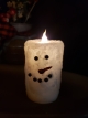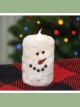 Snowman Votive Timer Pillar is a battery-operated pillar candle with a silicone-dipped bulb and a snowman design. Pillar is coated in textured, white wax, and it features a smiling snowman face made from black beads and a painted nose. A built-in timer feature allows the candle to stay lit for 6 hours, then off for 18 hours. Item requires 2 AA batteries (not included). Measures 3" high by 2" wide.
